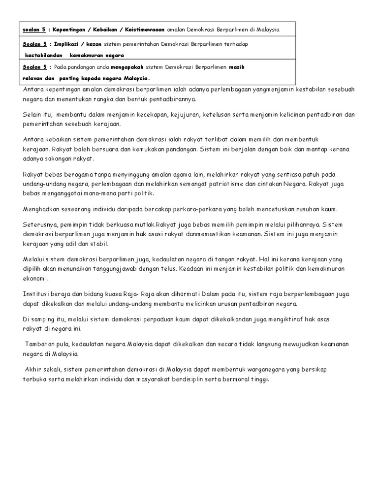 Sejak diperkenalkan sehingga kini,sistem tersebut telah dapat mewujudkan suasana poliktik yang stabil,aman, dan makmur. Maksudnya di sini ialah sistem demokrasi mengamalkan kaedah pemerintah yang dipilih sendiri oleh rakyat dan seterusnya pemerintah itu akan menyumbang kebajikan kepada rakyatnya secara adil. Kebaikan amalan sistem demokrasi yang diamalkan di negara ini. Sistem demokrasi di malaysia• kerajaan dipilih oleh rakyat melalui proses pilihan raya.•. Melalui pemerhatian, demokrasi dianggap sebagai satu amalan yang baik dan disanjung kerana beberapa faktor. Hal ini juga dapat mengekalkan keamanan dan keharmonian negara. Melalui demokrasi berparlimen,kewujudan seorang raja berperlembagaan telah mengekalkan kesinambungan. Malaysia yang kaya dengan kepelbagaian kaum dan perayaan yang banyak sudah sinonim di samping itu, amalan rumah terbuka membolehkan kita untuk menikmati pelbagai jenis juadah dari pelbagai kaum. Ijazah sarjana muda pentadbiran perniagaan pengurusan sumber manusiaijazah sarjana muda pengurusan perniagaan dengan kepujian pengurusan korporat unimasijazah sarjana muda pengurusan sistem pejabatijazah sarjana muda kaunseling upsiijazah sarjana muda kewanganijazah sarjana muda kelas. F.ainie f.ainie mengamalkan sistem demokrasi seperti rakyat bebas memilih pemimpin.rakyat diwajibkan mengundi ketika pilihan raya untuk memilih pemimpin setiap 5 tahun sekali. Kelemahan demokrasi kelemahan demokrasi berpunca daripada dua aliran yang mempunyai pandangan berbeza mengenai demokrasi serta mengandaikan bahawa sesuatu yang mustahil diwujudkan sistem pemerintahan yang berdasarkan ideologi demokrasi tulen manakala ada yang bersetuju bahawa amalan demokrasi dapat dicapai melalui kritikan serta memberi kuasa kepada golongan tertentu kebebasan perlu dikawal oleh pihak berkuasa. Pengajian malaysia docx isi kandungan bil perkara muka surat 1 pengenalan 2 u20133 2 ciri ciri demokrasi berparlimen 4 u20135 3 4 manfaat dan kelebihan course hero Kepentingan amalan sistem demokrasi berparlimen di docx kepentingan amalan sistem demokrasi berparlimen di malaysia kerajaan demokrasi berparlimen course hero